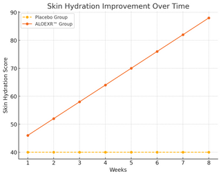 - Skin Hydration Improvement Over Time: Illustrates a steady increase in skin hydration levels for the ALOEXR™ group over 8 weeks, while the placebo group shows no change.