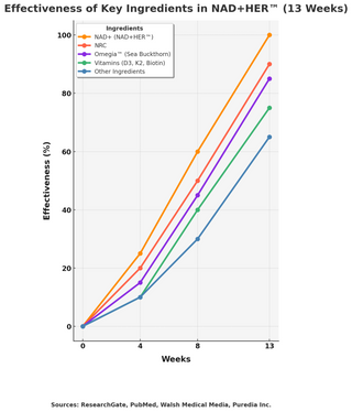 NAD+HER™ provides significant improvements, as shown in the graphs below depicting ingredient effectiveness over thirteen weeks. Featuring patented key ingredients like NAD+HER™ NAD+, Omegia™ Sea Buckthorn, and other ingredients, this formula supports skin cell regenration , collagen production, anti-aging, and immune balance, ultimately enhancing women's vitality when combined with a healthy diet and regular exercise.