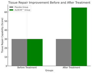 - Tissue Repair Improvement Before and After Treatment: Highlights a significant improvement in tissue repair capability for the ALOEXR™ group post-treatment, with no change observed in the placebo group.